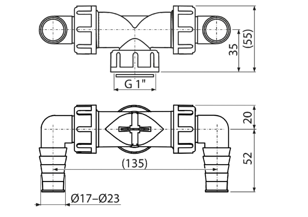 dvojité kolínko pro pračkové sifony G1" / 17–23 s klapkami (nahrazuje ALC-P148Z)