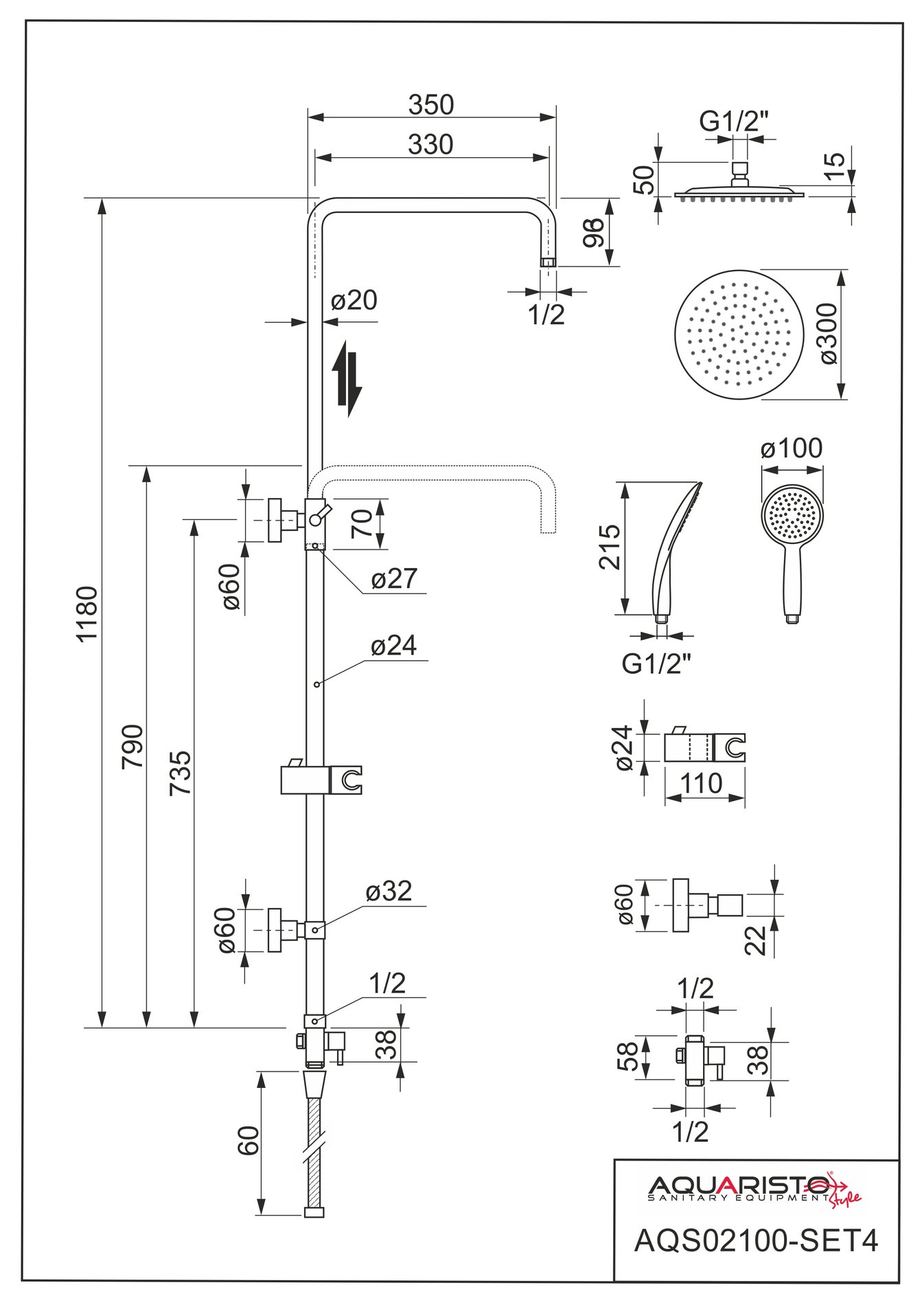 - keramický prepínač režimu mezi ruční a hlavovou sprchou (připojení tyč-přepínač 1/2" - připojení na zdroj vody 1/2")