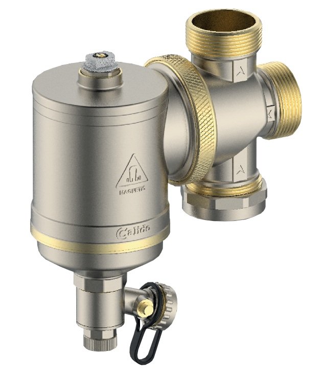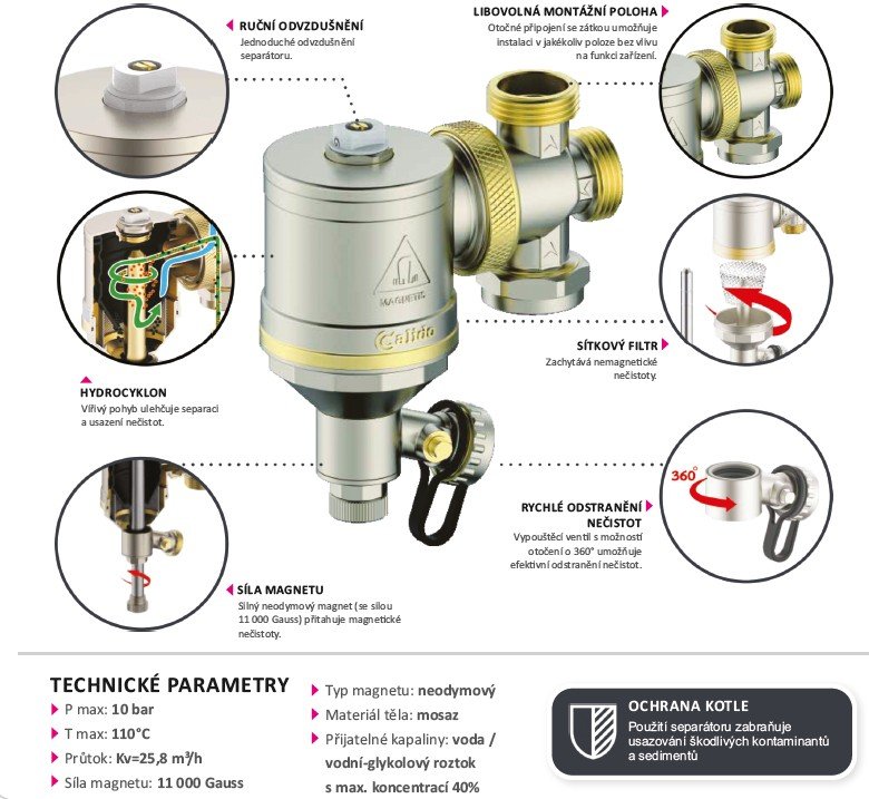 - Pevné kontaminanty jsou zachyceny sítkovým filtrem umístěným ve spodní části separátoru a přechází do usazovače. Očištěné topné médium po přechodu přes sítkový filtr přechází přes venkovní plášťový filtr do systému
