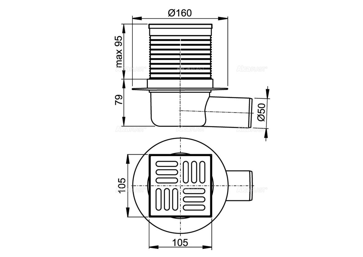 APV1 - Podlahová vpust 105×105/50 mm boční, mřížka nerez, vodní zápachová uzávěra