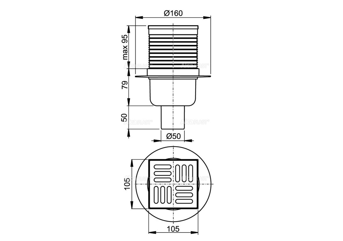 APV2 - Podlahová vpust 105×105/50 mm přímá, mřížka nerez, vodní zápachová uzávěra