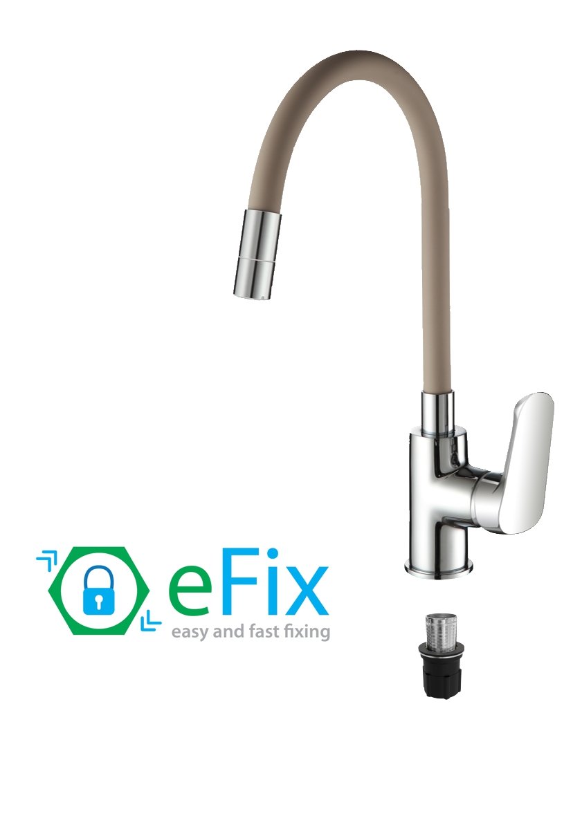 Dřezová stojánková vodovodní baterie s flexibilním (tvarovatelným) výtokovým ramínkem nabízí možnost "natvarovat" výtokové ramínko do co nejúčelnější polohy. Velmi praktickým konstrukčním vylepšením ramínka je dvoupolohový perlátor umístěný na jeho konci (viz obr. ve fotogalerii). Ramínko baterie je plně otočné (360°) |
